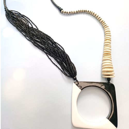 Natural stone necklace with a black beaded tassel and geometric black and white pendant. Bold statement piece with striking contrast and movement.