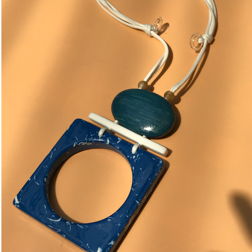Natural stone necklace with a blue open square pendant and oval top accent on white cords. Bold statement piece with a geometric modern look.