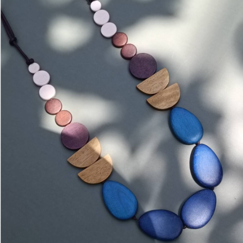Wood necklace with oval pebble beads in blue natural and mauve tones. Lightweight statement piece with soft modern contrast.