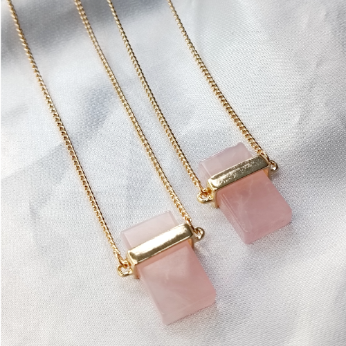 A soft pink rectangular pendant topped with a gold bar. Modern everyday piece with a feminine finish.