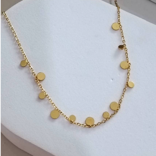 Stainless steel necklace with tiny round gold tone stations spaced along a delicate chain. Minimal everyday style with a refined layered look.