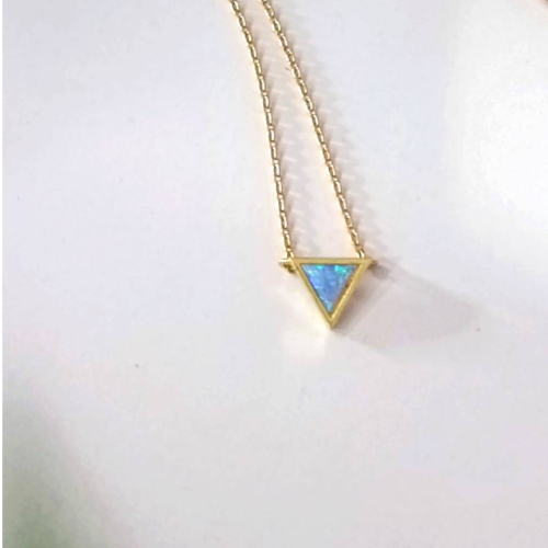 An open triangle pendant set with an iridescent crystal. Minimal everyday style with a sleek geometric finish.