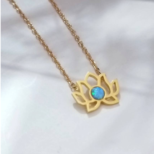 Stainless steel necklace with a lotus pendant and a turquoise center stone. Minimal everyday style with a bright symbolic finish.