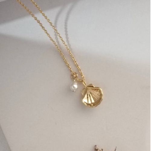 Stainless steel necklace with a small shell charm in a polished gold tone finish. Minimal everyday style with a soft coastal feel.