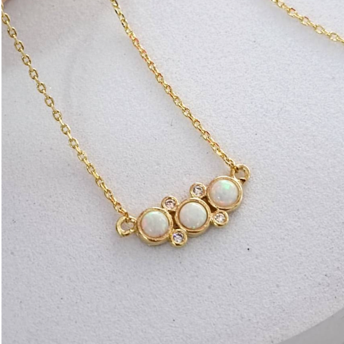 Opal stone inspired resin necklace with a curved row of pearl like stones on a delicate gold tone chain. Elegant everyday style with a soft luminous finish.