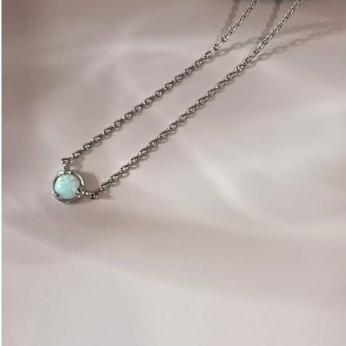 A small scalloped pendant necklace with a tiny aqua round stone in a polished silver tone bezel. Minimal everyday style with a fresh refined finish.