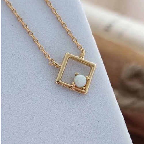 Natural stone necklace with a small square frame pendant and a pearl like center stone. Minimal everyday style with a soft geometric finish.