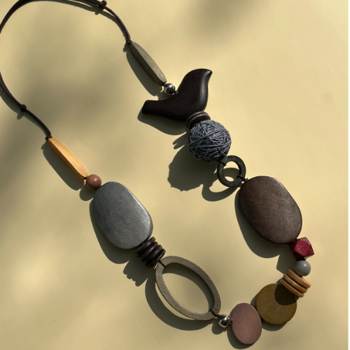 Wood necklace with grey black and brown beads linked by open circles on a cord. Contemporary statement piece with a handcrafted finish.