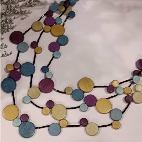 Wood necklace with layered strands of round discs in soft pink blue and yellow tones. Lightweight statement piece with a cheerful pastel finish.