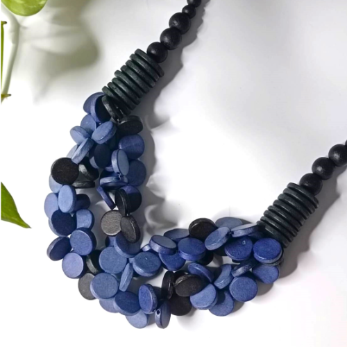 Wood necklace with dark blue floral clusters on a black cord base. Bold handcrafted piece with a sculptural look.