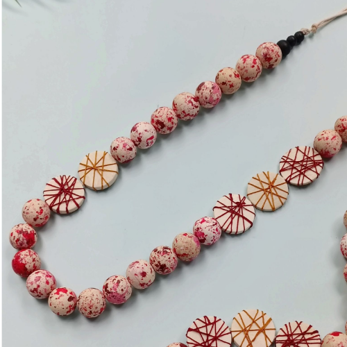 Necklace with red speckled beads and stitched disc accents. Artistic statement piece with a playful handcrafted finish.