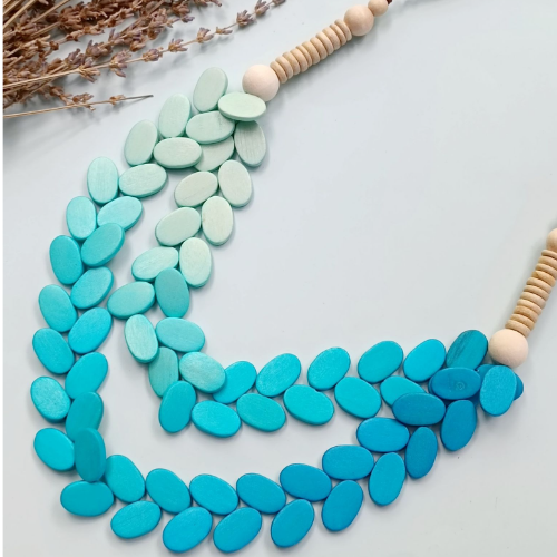 Wood necklace with layered blue oval beads and natural wood accents. Bold statement piece with a fresh ombre finish.