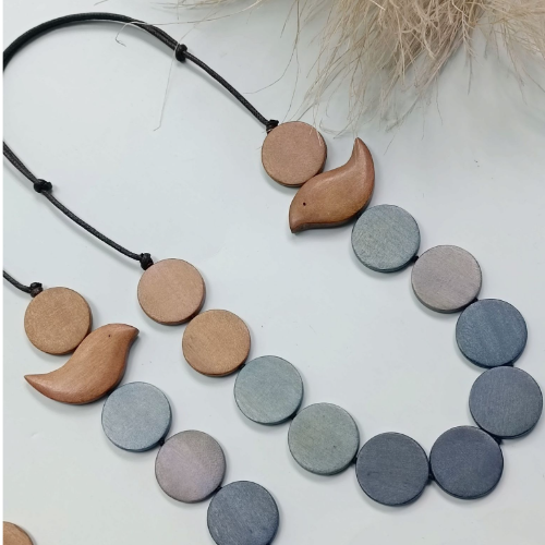 Wood necklace with grey discs and soft wood leaf accents on a cord. Lightweight statement piece with an earthy handcrafted finish.