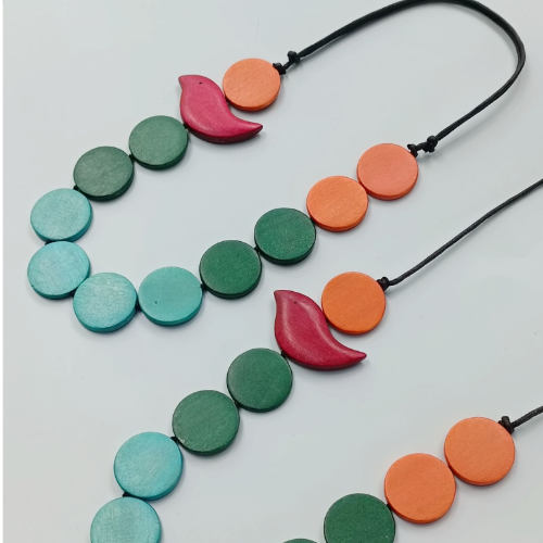 Wood necklace with green and aqua discs and bright pink leaf accents on a cord. Playful statement piece with a colorful handcrafted look.