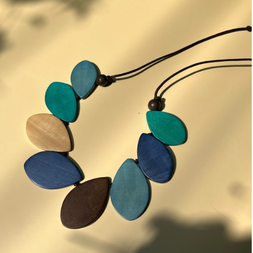 Wood necklace with layered red mustard and brown petal shapes on a cord. Bold statement piece with a playful handcrafted look.
