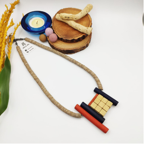 Wood necklace with cream bead strands and a navy rust and gold geometric tile pendant. Bold statement style with a modern handcrafted finish.