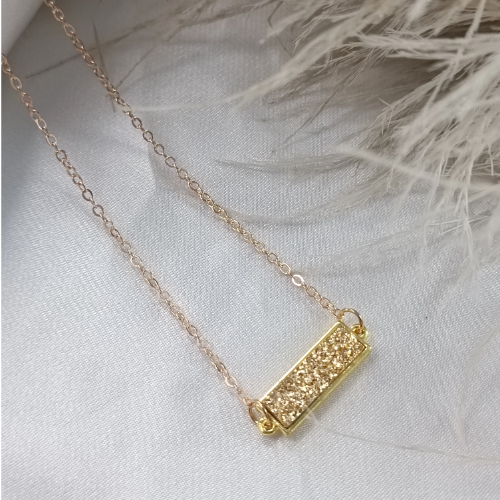 Stainless steel necklace in a gold finish with a glitter textured bar pendant. Minimal everyday piece with subtle shine.