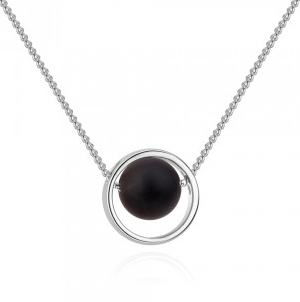 A round black sleek aynthetic pendant framed by silver tone orbit rings. Minimal modern style with an earthy finish.