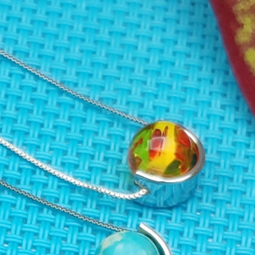 Acrylic necklace with a glossy yellow multicolor disc pendant in a silver frame. Lightweight statement piece with an abstract finish.