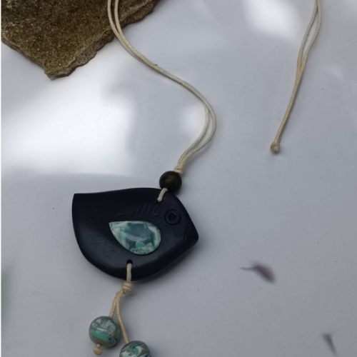 Wood necklace with an asymmetrical black pendant and marbled bead accents on a cord. Lightweight statement piece with modern earthy contrast.