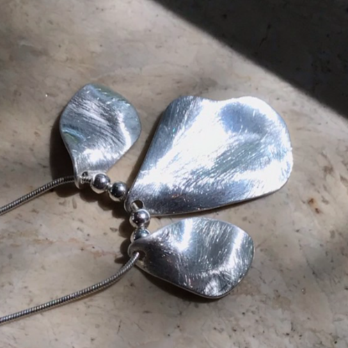 Alloy necklace with sculpted silver petal pendants on a fine chain. Modern statement piece with a fluid handcrafted look.