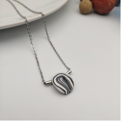 Clay necklace with a round pendant and flowing silver line detail. Minimal everyday piece with an artistic modern look.