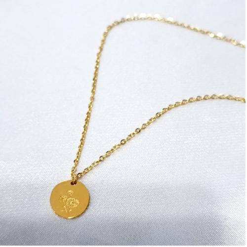 Stainless steel necklace with a small round pendant engraved with a flower motif. Delicate everyday piece with a polished finish.