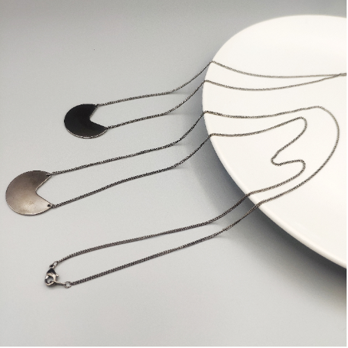 Alloy necklace with a smooth black crescent pendant on a dark chain. Minimal everyday piece with a clean modern finish.