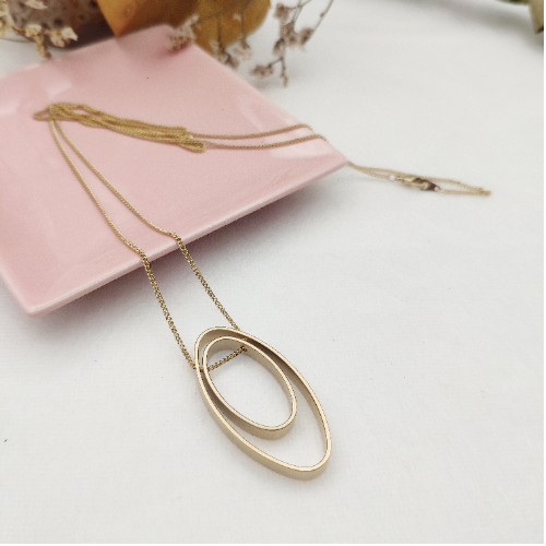 Alloy necklace with layered open oval pendants in a bright gold finish. Modern statement piece with a clean sculptural look.