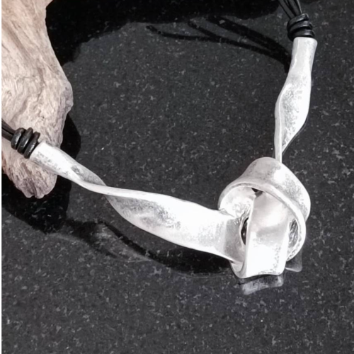 Alloy necklace with a sculptural silver tone wrap pendant on a black collar cord. Statement style with a fluid modern finish.