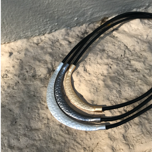 Alloy necklace with layered hammered arcs in silver black and gold tones on a black cord. Bold statement piece with a sculptural modern finish.