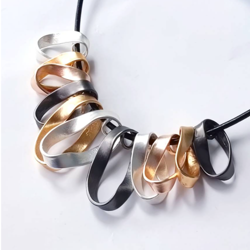 Alloy necklace with layered loop pendants in black silver and rose gold tones on a black cord. Statement style with a bold sculptural finish.