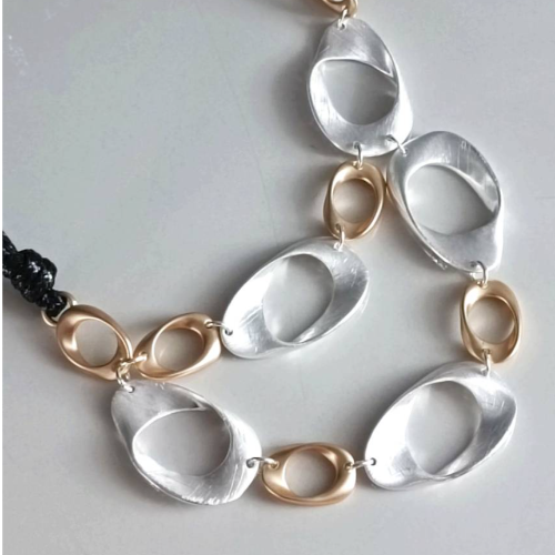 Alloy necklace with oversized mixed metal links in silver and gold tones. Bold statement style with a sculptural modern look.