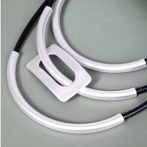 Alloy necklace with curved white enamel links and silver tone accents. Statement style with a bold graphic finish.