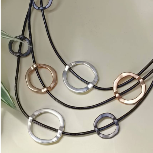 Alloy necklace with mixed open circle links in silver and rose gold tones. Statement style with a modern layered look.
