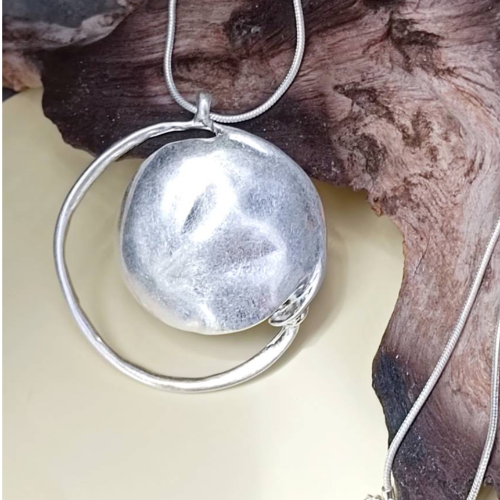 Alloy necklace with a large irregular silver tone disc pendant on a simple chain. Statement style with a clean modern finish.