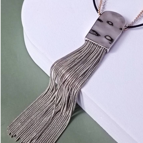 Alloy necklace with a long silver tone tassel pendant and a structured loop top. Statement style with fluid movement and a modern finish.
