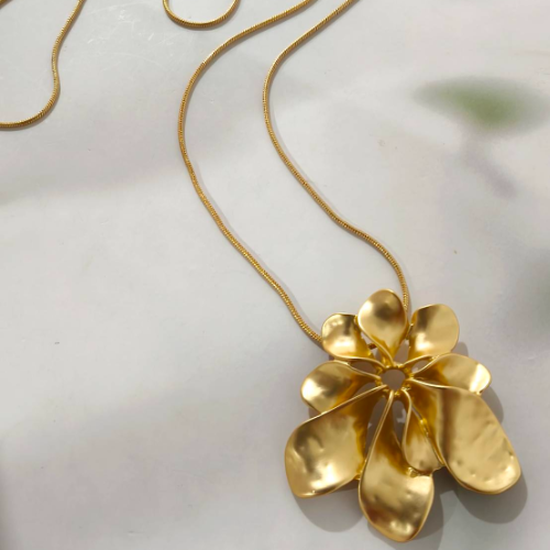 Alloy necklace in a gold finish with layered flower petal forms. Bold statement piece with a bright sculptural look.