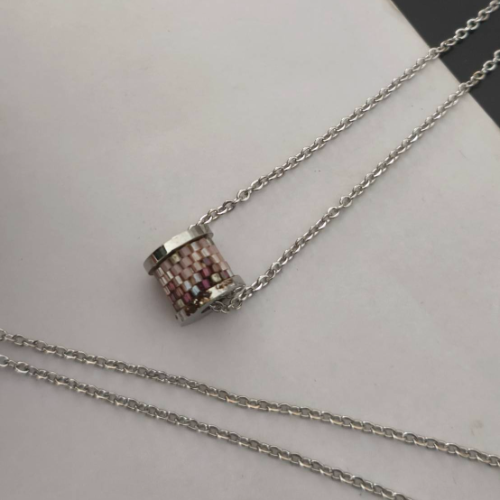 Stainless steel pendant necklace with a silver spool form and soft pink beadwork. Delicate modern design with a polished handcrafted look.