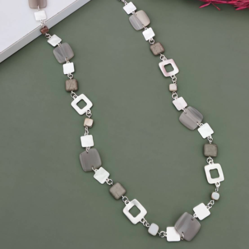 Acrylic link necklace with grey white and stone toned geometric pieces connected in a modern linear layout. Lightweight statement style with a clean contemporary look.