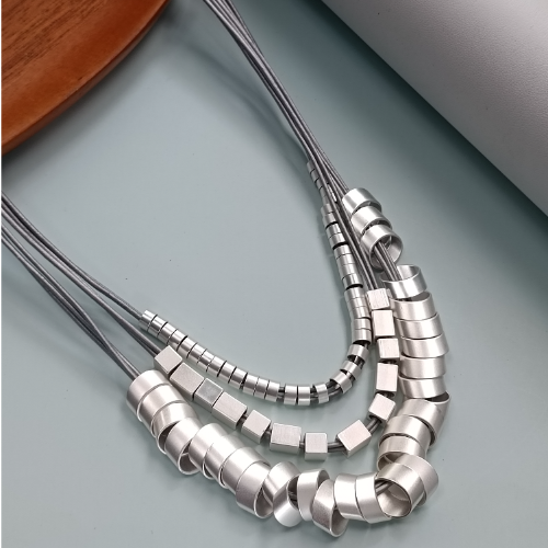 Alloy necklace with layered silver tubes cubes and curled accents on grey cords. Bold statement piece with a modern sculptural look.
