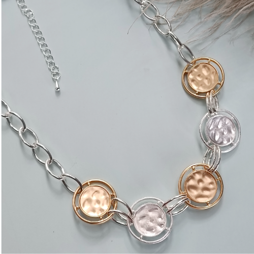 Alloy necklace with linked hammered discs in mixed gold and silver tones. Bold statement piece with a modern artisan look.