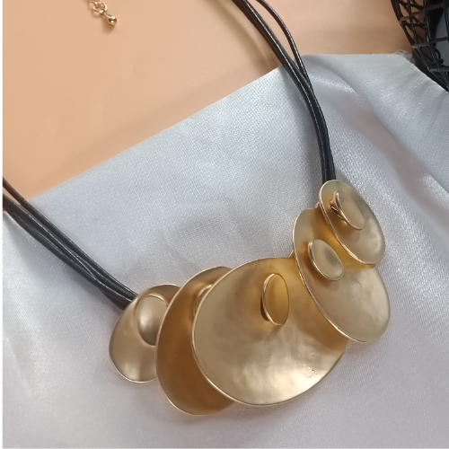 Alloy necklace with layered hammered gold discs on black cords. Bold statement piece with a modern sculptural finish.