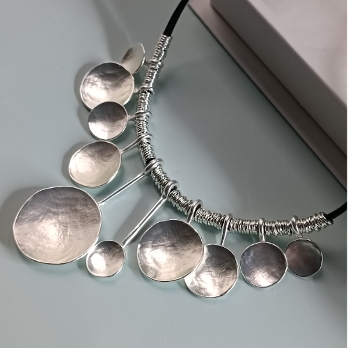 Alloy necklace with hammered silver discs arranged along a black collar cord. Bold statement piece with an artistic finish.