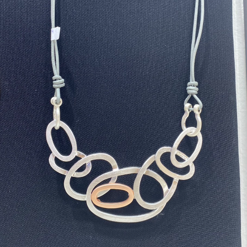Alloy necklace with linked silver ovals and a rose gold accent on grey cords. Bold statement piece with a fluid modern look.