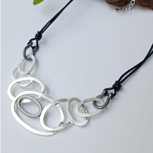 Alloy necklace with layered linked ovals on black cords. Bold statement piece with a fluid modern look.