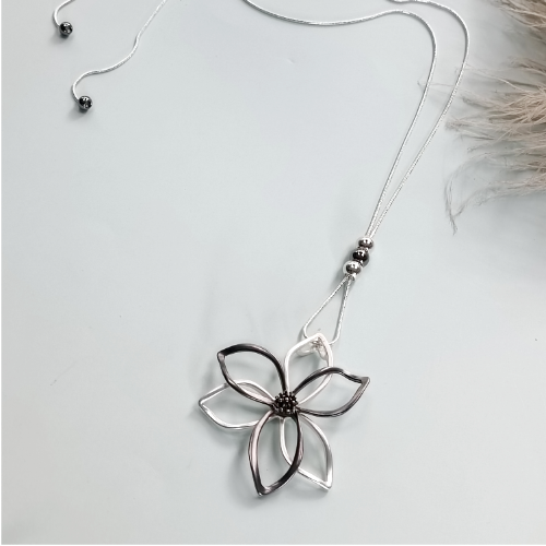 Alloy necklace with a floral outline pendant suspended from a black cord. Contemporary statement piece with bold contrast.