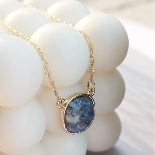 Natural stone necklace with a blue oval pendant in a gold frame. Elegant everyday piece with a refined finish.