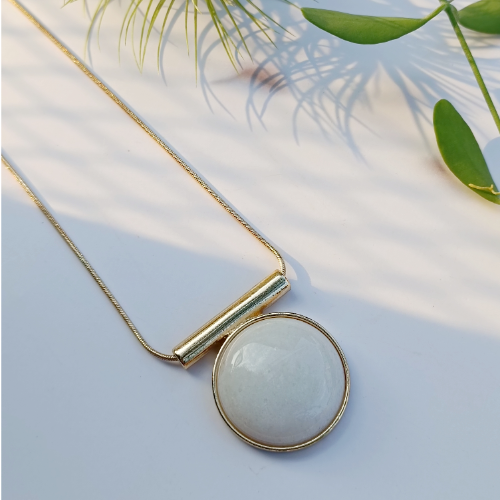 A necklace with a round white pendant suspended from a slim gold bar. Minimal elegant piece with a clean modern finish.