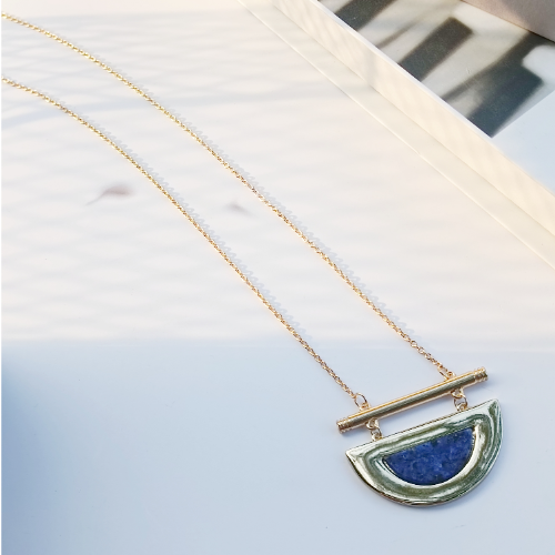 Elegant necklace with a blue half moon pendant set in a gold frame. Elegant everyday piece with a modern minimal finish.